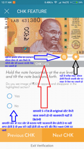 • आपको आपकी नोट में क्या क्या चेक करना हे वो आपको ये एप्लीकेशन में स्टेप बाय स्टेप बताया जायेगा तो आपको बस स्टेप जेसे जेसे एप्लीकेशन बताये वेसे चेक करते जाना हे और एप्लीकेशन में जो जो निशानी बतायी जाये उसी तरह आपके पास जो नोट हे उसमे आपको मैच करना हे और Next CHK से आगे बढ़ना हे और आपको सभी step ख़त्म करते जाना हे और आपकी नोट में उसे मैच करते जाना हे. (इस आप में जो लाइट और कैमरे का option दिया हे वो सिर्फ़ आपको देखने के लिये दिया गया हे. आप एसा न समजे के कैमरे से स्कैन करे और आटोमेटिक नोट असली हे के नकली उसके बारे मे नहीं जान सकते हो. ये एप्लीकेशन में आपको जो निशानी बताई जाये आपको खुद से आपके नोट में चेक करना हे.)