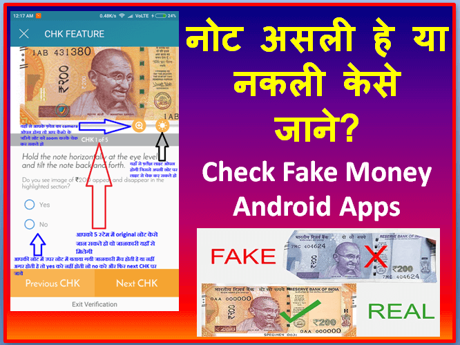 - आपको आपकी नोट में क्या क्या चेक करना हे वो आपको ये एप्लीकेशन में स्टेप बाय स्टेप बताया जायेगा तो आपको बस स्टेप जेसे जेसे एप्लीकेशन बताये वेसे चेक करते जाना हे और एप्लीकेशन में जो जो निशानी बतायी जाये उसी तरह आपके पास जो नोट हे उसमे आपको मैच करना हे और Next CHK से आगे बढ़ना हे और आपको सभी step ख़त्म करते जाना हे और आपकी नोट में उसे मैच करते जाना हे. (इस आप में जो लाइट और कैमरे का option दिया हे वो सिर्फ़ आपको देखने के लिये दिया गया हे. आप एसा न समजे के कैमरे से स्कैन करे और आटोमेटिक नोट असली हे के नकली उसके बारे मे नहीं जान सकते हो. ये एप्लीकेशन में आपको जो निशानी बताई जाये आपको खुद से आपके नोट में चेक करना हे.)