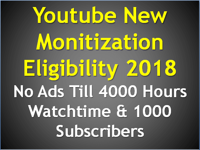 अगर आप Youtube पे नया चैनल बनाते हे तो आपको YouTube Monetization के लिए आपके चैनल पे 10,000 views मिल जाने के बाद Youtube आपके चैनल को रिव्यू करने के बाद आपका YouTube Monetization On करता था लेकिन अब YouTube ने अपनी Monetization Policy में Date.16 January 2018 से change किया हुवा हे और उसे Date. 20 February 2018 से लागु किया जायेगा.